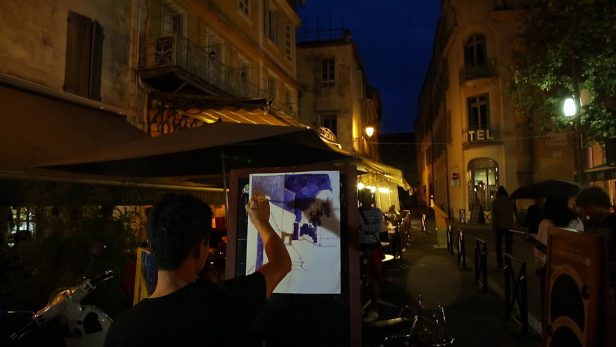 ゴッホの描いたカフェを発見するや、「あの絵のままだ」と興奮し、その場でキャンバスを立て写生を始める。