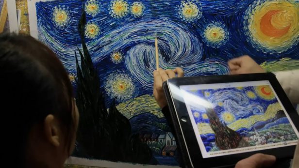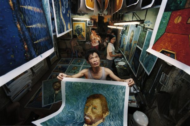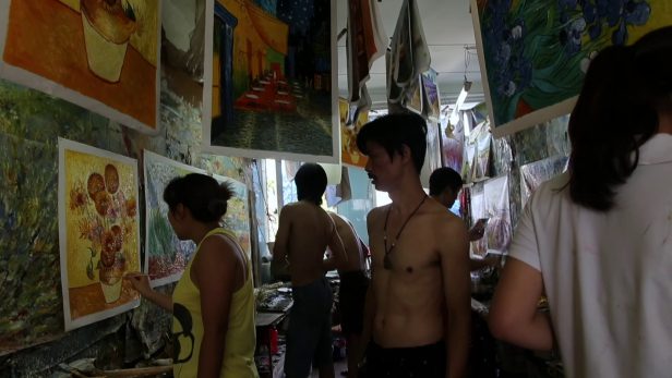 中国・深圳市近郊の大芬(ダーフェン)村。世界で流通する複製画の半分がここで生産されているという。多数のスタッフが分担しながら、ゴッホの複製画を制作している風景は、日本のアニメ制作現場を彷彿とさせる。