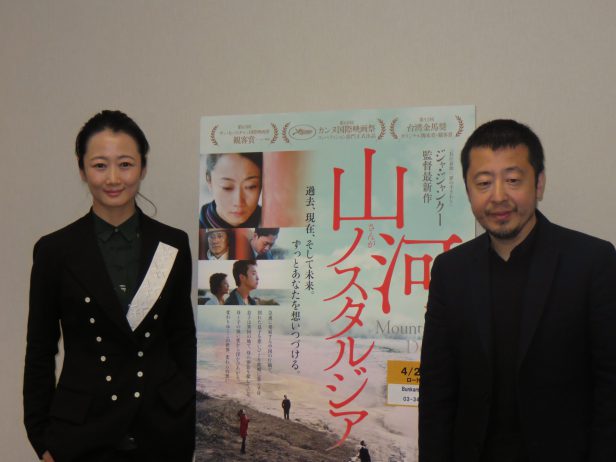 1999年、2014年、2025年という3つの時代を背景に、一人の女性の半生を描いた「山河ノスタルジア」。公開を前に、監督のジャ・ジャンクーと主演女優のチャオ・タオが来日し、都内での記者会見に出席した。ジャ監督は「中国社会の急激な発展に翻弄される人々の姿を描いた」と語った。