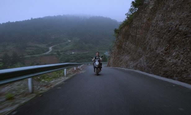 延々と続く山道。谷川を挟んで、向こう岸にも深緑の山が連なる。舗装された道路をスクーターが走る。ミャオ族の楽器演奏を聴きたいと一旦別行動となるが、再び合流し、スクーターで走る。