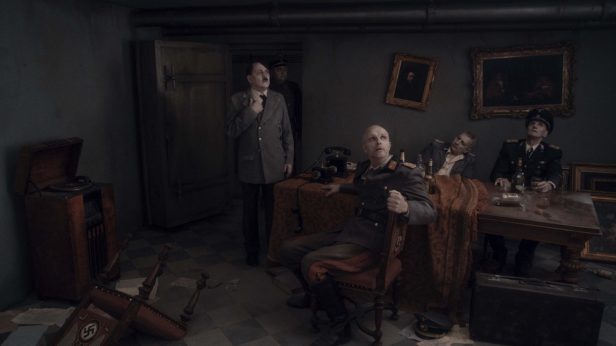 一方、平凡な人生には起こり得ないであろうシーンも現れる。包丁を持った男が、胸から血を流して息絶えた(?)女を抱きかかえている場面。敗色が決定的となった状況で、ナチス将校が、ヒトラーとともに、終わりの時を待つ場面。