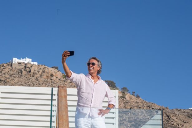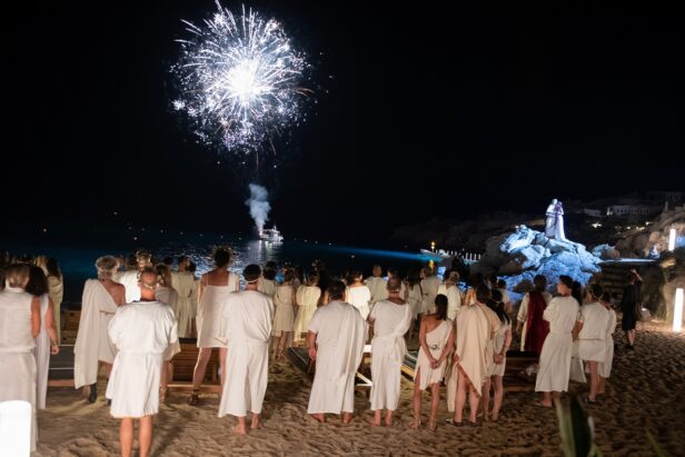 ギリシャのミコノス島といえば、ハリウッド映画にもしばしば登場するヨーロッパ屈指の高級リゾート地である。その美しいビーチを見下ろす絶好の場所で、映画のセットのようなものが組み立てられている。どうやら古代ローマのコロッセオ(円形競技場)らしい。