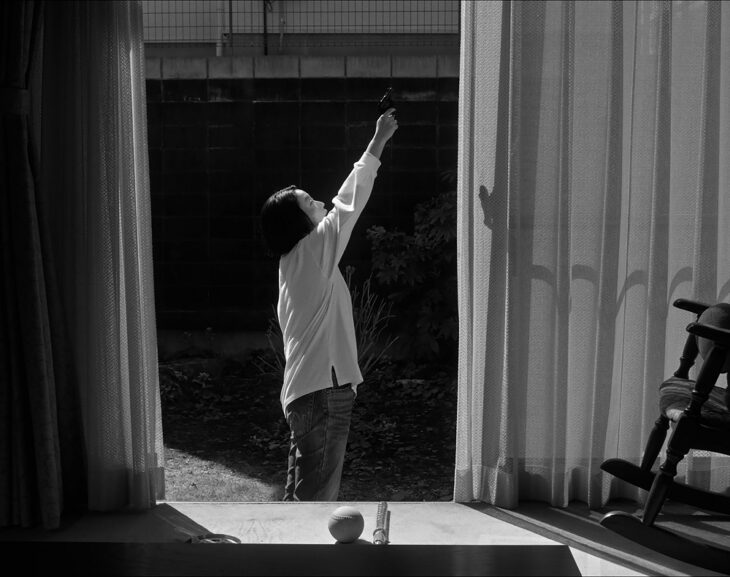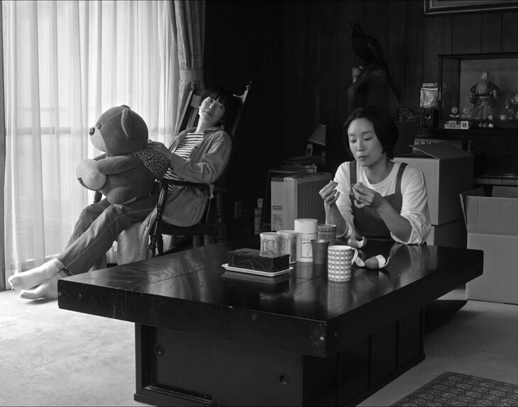 画面の手前から奥まで伸びる左右対称な“縦の構図”が印象的だ。セットを組まず、家屋の中で撮影する場合、カメラポジションは自ずと制限される。その制約を逆手にとって生み出した独創的なスタイルだ。